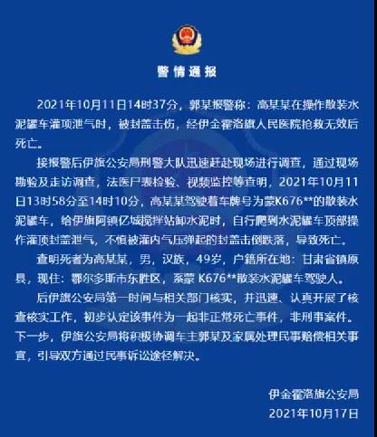 此前,就有公安局發(fā)布警情通報(bào)稱,位于內(nèi)蒙古自治區(qū)鄂爾多斯市伊旗的散裝水泥罐車駕駛?cè)烁吣衬吃诓僮鞴揄?xiàng)泄氣時(shí),被封蓋擊傷,經(jīng)醫(yī)院搶救無效后死亡。