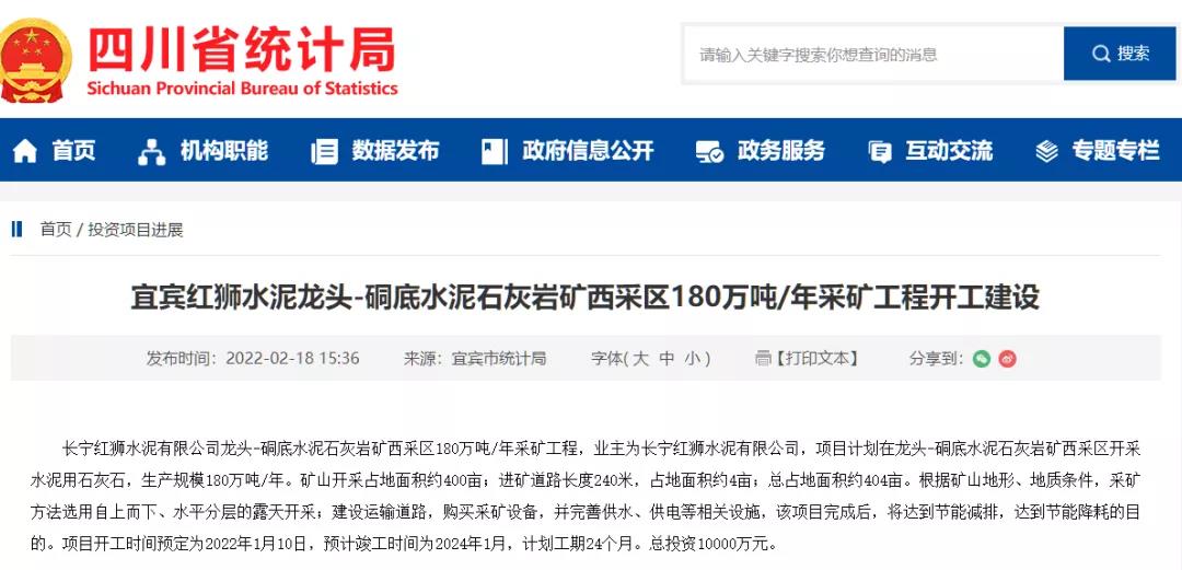 四川省統(tǒng)計局消息,長寧紅獅水泥有限公司龍頭-硐底水泥石灰?guī)r礦西采區(qū)180萬噸/年采礦工程,業(yè)主為長寧紅獅水泥有限公司,項目計劃在龍頭-硐底水泥石灰?guī)r礦西采區(qū)開采水泥用石灰石,生產(chǎn)規(guī)模180萬噸/年。