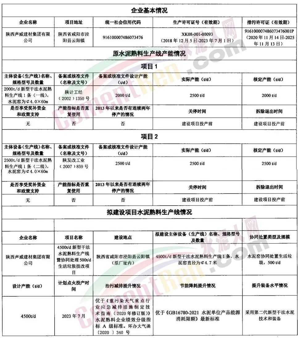 3月3日,陜西省工業(yè)和信息化廳發(fā)布《關(guān)于對(duì)陜西聲威建材集團(tuán)有限公司水泥熟料生產(chǎn)線“拆二合一”技術(shù)改造方案產(chǎn)能的公示》 。公示內(nèi)容顯示陜西聲威建材集團(tuán)有限公司擬通過(guò)拆除退出兩條2500t/d熟料生產(chǎn)線,在原廠區(qū)內(nèi)新建一條4500t/d新型干法水泥熟料生產(chǎn)線,配套協(xié)同處置500t/d生產(chǎn)垃圾項(xiàng)目。新建生產(chǎn)線將采用第二代新型干法水泥技術(shù)和裝備 ,計(jì)劃于2023年7月點(diǎn)火投產(chǎn)。