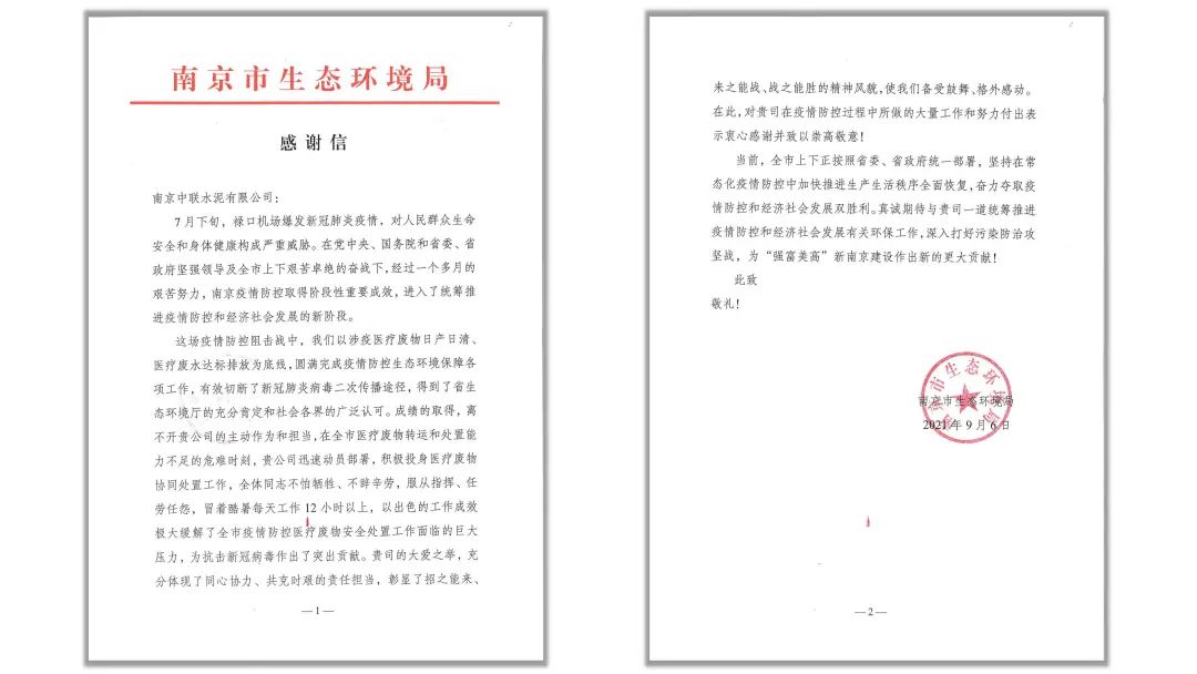 “貴司的大愛之舉,充分體現(xiàn)了同心協(xié)力、共克時(shí)艱的責(zé)任擔(dān)當(dāng),彰顯了招之能來、來之能戰(zhàn)、戰(zhàn)之能勝的精神風(fēng)貌,使我們備受鼓舞、格外感動(dòng)。在此,對(duì)貴司在疫情防控過程中所做的大量工作和努力付出表示衷心感謝并致以崇高敬意!”這是南京市生態(tài)環(huán)境局于2021年9月6日給予南京中聯(lián)水泥有限公司的一封感謝信。