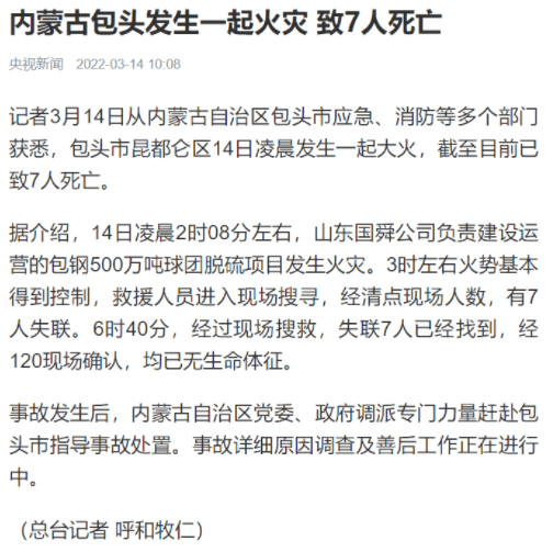 事故發(fā)生后,內(nèi)蒙古自治區(qū)黨委、政府調(diào)派專門力量趕赴包頭市指導(dǎo)事故處置。事故詳細(xì)原因調(diào)查及善后工作正在進(jìn)行中。