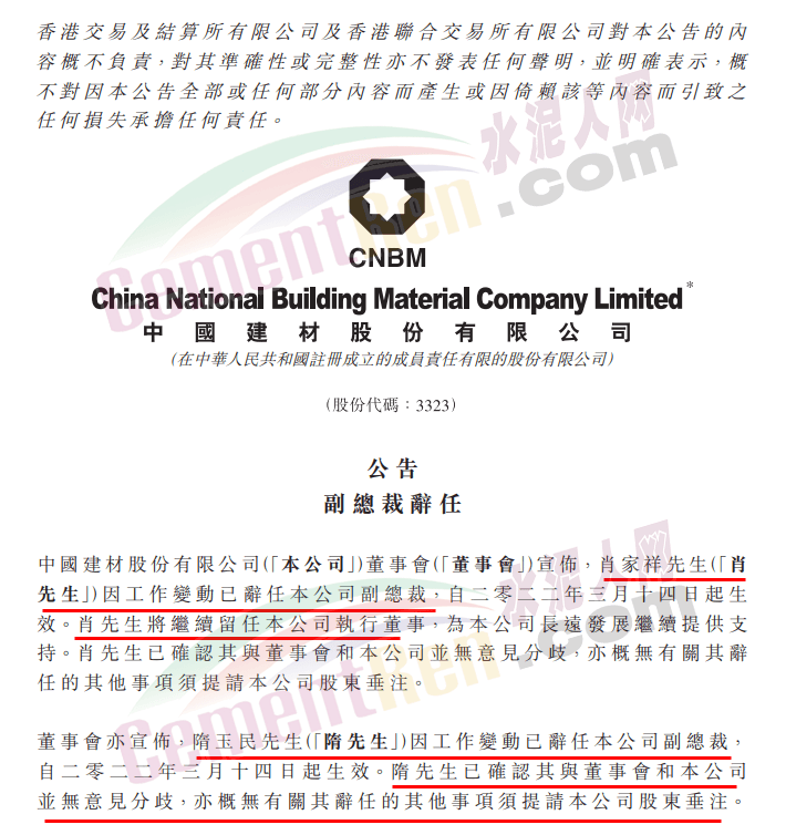 中國建材公告,肖家祥因工作變動(dòng)已辭任公司副總裁,自2022年3月14日起生效。肖將繼續(xù)留任公司執(zhí)行董事,為公司長遠(yuǎn)發(fā)展繼續(xù)提供支持。董事會亦宣布,隋玉民因工作變動(dòng)已辭任公司副總裁,自2022年3月14日起生效。