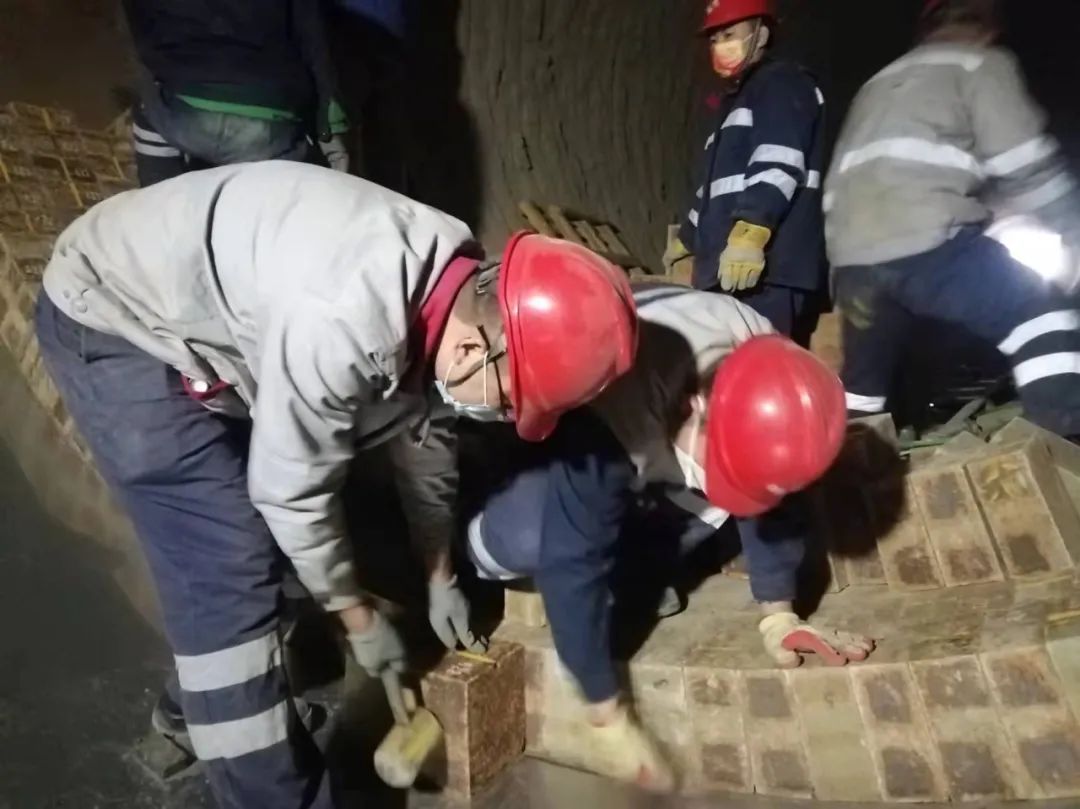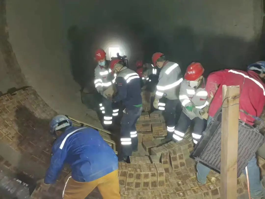 但在檢修后期,由于疫情的持續(xù)影響,造成外省筑爐施工人員始終無法到位,窯磚砌筑緩慢,嚴(yán)重影響到整體施工進(jìn)度。但工期就是命令,為了保證按時(shí)點(diǎn)火生產(chǎn)。生產(chǎn)運(yùn)行部門從部門負(fù)責(zé)人到車間主任到普通員工一起上陣與有限的筑爐人員協(xié)同配合,從清理廢舊窯磚、新磚砌筑、燃燒器精確定位到中控操作員組織協(xié)調(diào)精心操作,終于按時(shí)完成了砌筑工作。
