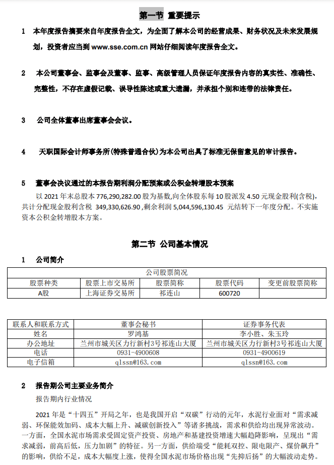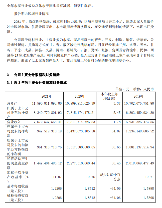 祁連山水泥3月17日晚間發(fā)布年度業(yè)績報告同時連發(fā)多份公告。年度報告中提到,2021年?duì)I業(yè)收入約76.73億元,同比減少1.78%;歸屬于上市公司股東的凈利潤盈利約9.48億元,同比減少34.07%;基本每股收益盈利1.2206元,同比減少34.06%。