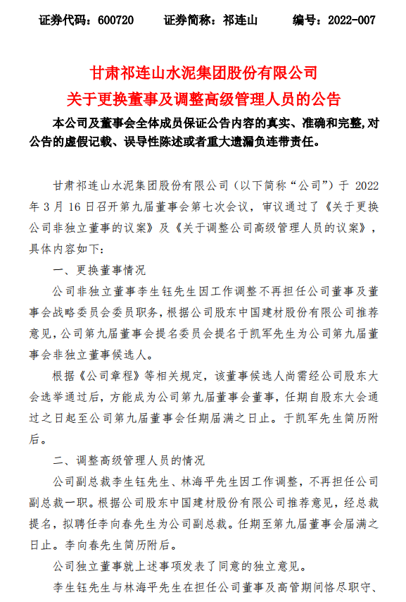 同時發(fā)布的《關(guān)于更換董事及調(diào)整高級管理人員的公告》稱,公司非獨(dú)立董事李生鈺先生因工作調(diào)整不再擔(dān)任公司董事及董事會戰(zhàn)略委員會委員職務(wù),根據(jù)公司股東中國建材股份有限公司推薦意見,公司第九屆董事會提名委員會提名于凱軍先生為公司第九屆董事會非獨(dú)立董事候選人。公司副總裁李生鈺先生、林海平先生因工作調(diào)整,不再擔(dān)任公司副總裁一職。根據(jù)公司股東中國建材股份有限公司推薦意見,經(jīng)總裁提名,擬聘任李向春先生為公司副總裁。