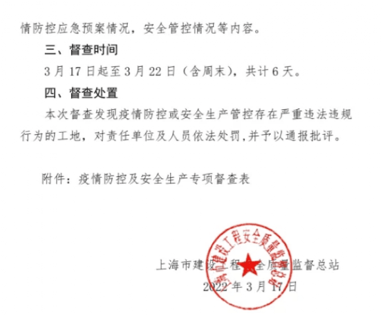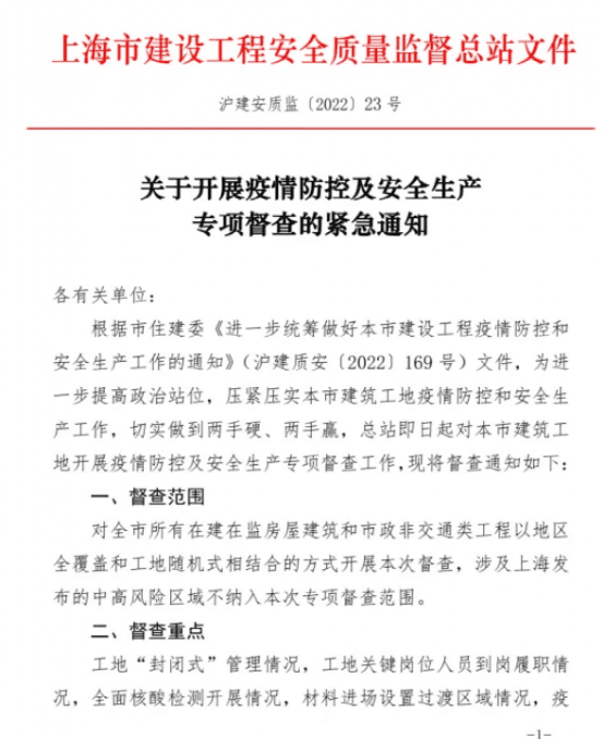 根據(jù)市住建委發(fā)布《進(jìn)一步統(tǒng)籌做好本市建設(shè)工程疫情防控和安全生產(chǎn)工作的通知》(滬建質(zhì)安〔2022〕169號(hào))文件稱(chēng),總站即日起對(duì)本市建筑工地開(kāi)展疫情防控及安全生產(chǎn)專(zhuān)項(xiàng)督查工作。