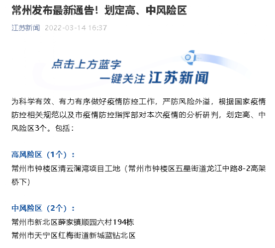 江蘇常州最新通告顯示,常州市鐘樓區(qū)清云瀾灣項(xiàng)目工地被列入高風(fēng)險(xiǎn)區(qū),截至3月14日8時(shí),該工地確診12+3人。
