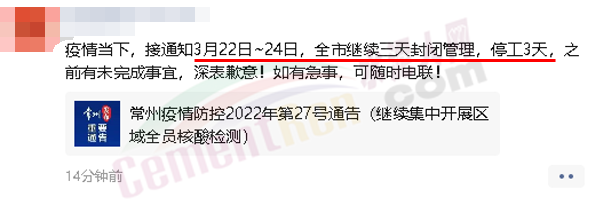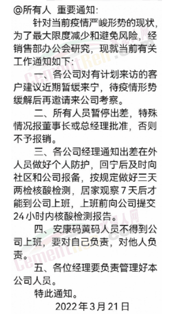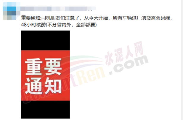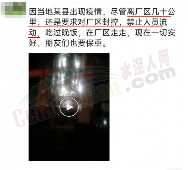 有網(wǎng)友發(fā)消息稱(chēng),因當(dāng)?shù)啬晨h出現(xiàn)疫情,距離水泥廠熟料基地幾十公里,但仍要求對(duì)廠區(qū)進(jìn)行封閉管控,禁止人員流動(dòng),不許進(jìn)出。