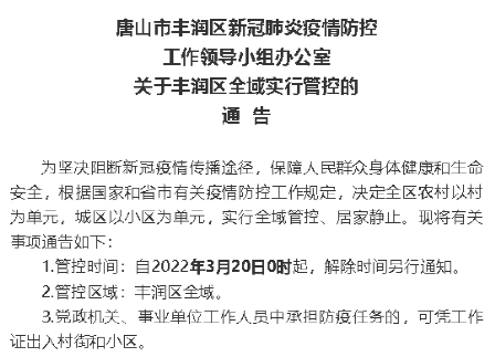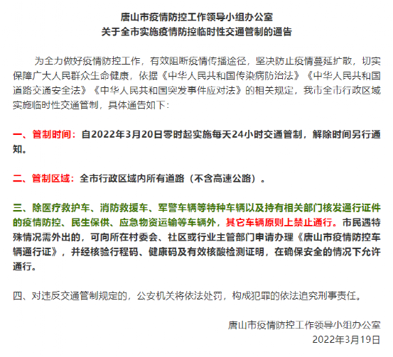 同日,唐山市新冠肺火防控工作領(lǐng)導(dǎo)小組辦公室發(fā)布加強(qiáng)全市重點(diǎn)場(chǎng)所管控的通告,對(duì)全市實(shí)施疫情防控臨時(shí)性交通管制。