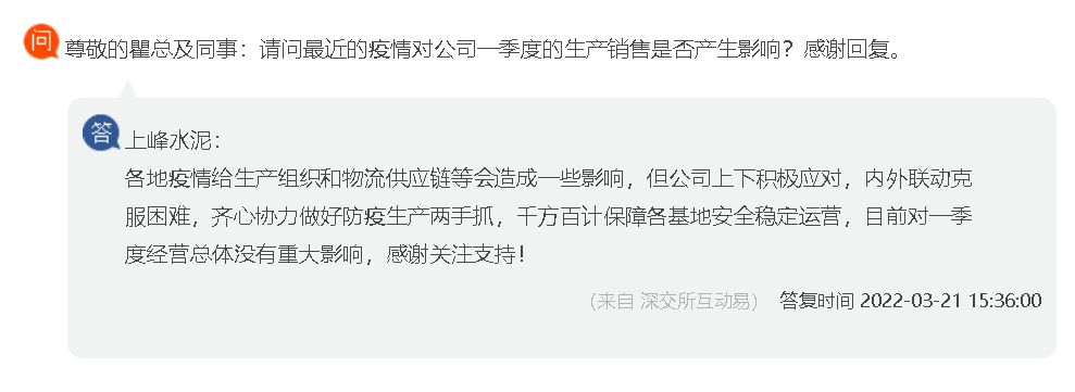 有投資者在上市平臺(tái)向上峰水泥問(wèn)及疫情對(duì)公司一季度的生產(chǎn)銷(xiāo)售是否產(chǎn)生影響時(shí),上峰水泥回復(fù)稱(chēng),各地疫情給生產(chǎn)組織和物流供應(yīng)鏈等會(huì)造成一些影響,但公司上下積極應(yīng)對(duì),內(nèi)外聯(lián)動(dòng)克服困難,齊心協(xié)力做好防疫生產(chǎn)兩手抓,千方百計(jì)保障各基地安全穩(wěn)定運(yùn)營(yíng)。
