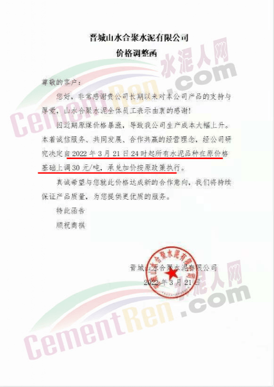 據(jù)水泥人網(wǎng)信息中心數(shù)據(jù),3月20日前后,山西多區(qū)域水泥價(jià)格通知上調(diào),山西晉城多家企業(yè)通知上調(diào)水泥價(jià)格30元/噸。晉城市鉆石水泥有限責(zé)任公司通知稱,根據(jù)市場行情變化,原材料價(jià)格上漲,水泥生產(chǎn)成本不斷增高,為確保正常供應(yīng)合作,公司本著互惠互利的原則,經(jīng)公司會(huì)議研究決定自3月21日上午10時(shí)30分上調(diào)水泥價(jià)格30元/噸,上調(diào)后礦渣32.5袋裝水泥執(zhí)行503元/噸,復(fù)合42.5袋裝水泥執(zhí)行543元/噸,普通42.5散裝水泥執(zhí)行543元/噸。