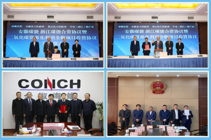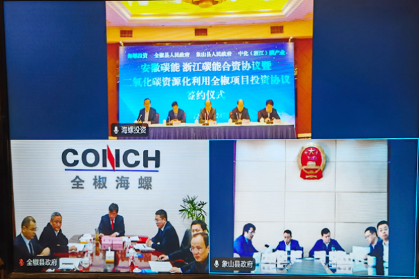 2022年3月24日上午,海螺投資公司與全椒縣政府、象山縣政府、中化膜產(chǎn)業(yè)公司通過云簽約形式,正式簽署安徽碳能、浙江碳能合資協(xié)議以及二氧化碳資源化利用全椒項(xiàng)目投資協(xié)議。全椒縣、象山縣主要領(lǐng)導(dǎo)及相關(guān)部門負(fù)責(zé)同志,中化膜產(chǎn)業(yè)公司總經(jīng)理周海明,海螺集團(tuán)黨委委員、總經(jīng)濟(jì)師、海螺投資總經(jīng)理丁鋒,海螺投資總經(jīng)理助理程竹松、海螺集團(tuán)戰(zhàn)略企劃部副部長盧叔敏等出席儀式并見證簽約。