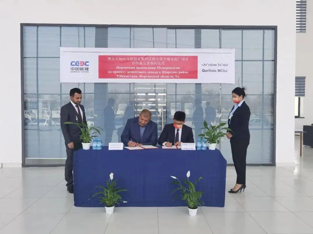 中國能建國際集團(tuán)與烏茲別克斯坦喬伊丹姆房屋建設(shè)有限公司簽署費(fèi)爾干納州烏茲別克斯坦區(qū)舒爾蘇夫鎮(zhèn)水泥廠項(xiàng)目合作協(xié)議。費(fèi)爾干納州州長參與見簽。