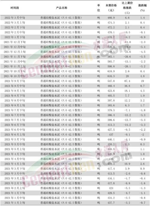 水泥企業(yè)為消化成本壓力,流通領(lǐng)域報(bào)價(jià)也出現(xiàn)上漲。2022年3月中旬普通硅酸鹽水泥(P.O 42.5散裝)為480.9元/噸,2021年1月上旬普通硅酸鹽水泥(P.O 42.5散裝)為437.7元/噸,上漲了43.2元/噸,漲幅9.87%。