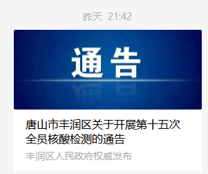 河北唐山豐潤(rùn)區(qū)政府4月1日晚21時(shí)42分發(fā)布通告稱,根據(jù)當(dāng)前疫情防控形勢(shì),定于2022年4月2日13點(diǎn),對(duì)豐潤(rùn)區(qū)域內(nèi)所有居民(含外來人員)開展第十五次全員核酸檢測(cè)。