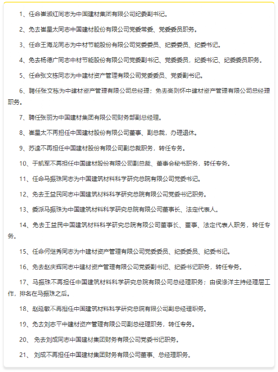 1月初,中國建材集團有限公司發(fā)布數(shù)十條高層任免通知,對中國建材部分高層職務(wù)進行了重新任免。