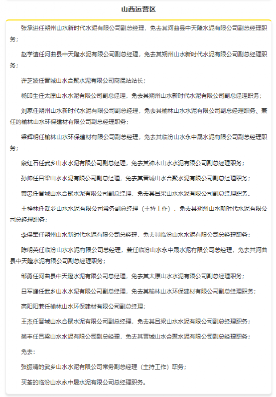1月中旬,山東山水集團有限公司發(fā)布人事任命,對旗下多個運營區(qū)進行人事調(diào)整,涉及魯西、魯東、魯南、東北和山西等多個區(qū)域。