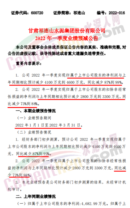 祁連山 (SH 600720,收盤價(jià):11.04元)4月7日晚間發(fā)布業(yè)績(jī)預(yù)告,預(yù)計(jì)公司2022年一季度實(shí)現(xiàn)歸屬于上市公司股東的凈利潤(rùn)與上年同期相比預(yù)計(jì)減少4100萬元到4600萬元,同比減少87%到99%。