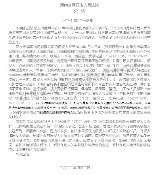 4月2日河南省輝縣市人民法院公告稱,根據(jù)債權(quán)人河南輝縣農(nóng)村商業(yè)銀行股份有限公司的申請,于2022年3月16日裁定受理新鄉(xiāng)市李固水泥有限公司破產(chǎn)重整一案,并于2022年3月31日指定河南銀基律師事務(wù)所與河南眾盈律師事務(wù)所共同擔(dān)任新鄉(xiāng)市李固水泥有限公司管理人,負責(zé)新鄉(xiāng)市李固水泥有限公司的重整工作。定于2022年6月6日上午9時通過“釘釘”APP“新鄉(xiāng)市李固水泥有限公司債權(quán)人會議群”以網(wǎng)絡(luò)視頻方式召開第一次債權(quán)人會議。