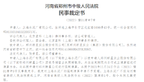 3月30日河南省鄭州市中級人民法院受理上海水泥廠有限公司對鄭州新星實業(yè)股份有限公司的強制清算申請。