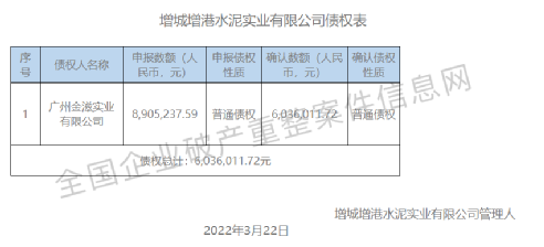 3月22日增城增港水泥實業(yè)有限公司管理人發(fā)布倒債權(quán)表顯示,企業(yè)普通權(quán)總計為6036011.72元。