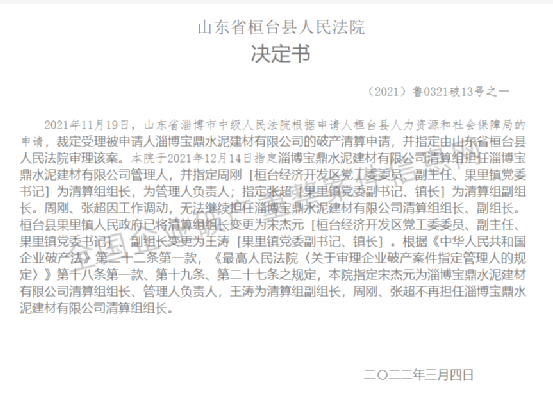 3月4日山東省恒臺縣人民法院決定書稱,2021年11月19日,山東省淄博市中級人民法院根據(jù)申請人桓臺縣人力資源和社會保障局的申請,裁定受理被申請人淄博寶鼎水泥建材有限公司的破產(chǎn)清算申請,并指定由山東省桓臺縣人民法院審理該案。本院于2021年12月14日指定淄博寶鼎水泥建材有限公司清算組擔(dān)任淄博寶鼎水泥建材有限公司管理人。