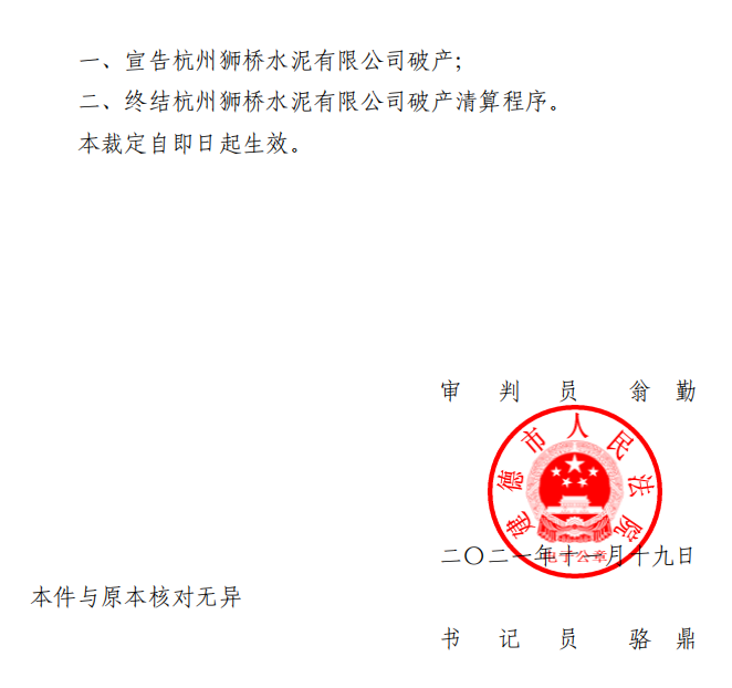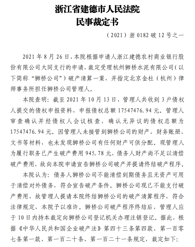 1月19日浙江省建德市人民法院發(fā)布《民事裁定書》稱,2021年8月26日,本院根據(jù)申請人浙江建德農(nóng)村商業(yè)銀行股份有限公司大同支行的申請,裁定受理杭州獅橋水泥有限公司破產(chǎn)清算一案,并指定北京金杜(杭州)律師事務(wù)所擔(dān)任獅橋公司管理人。