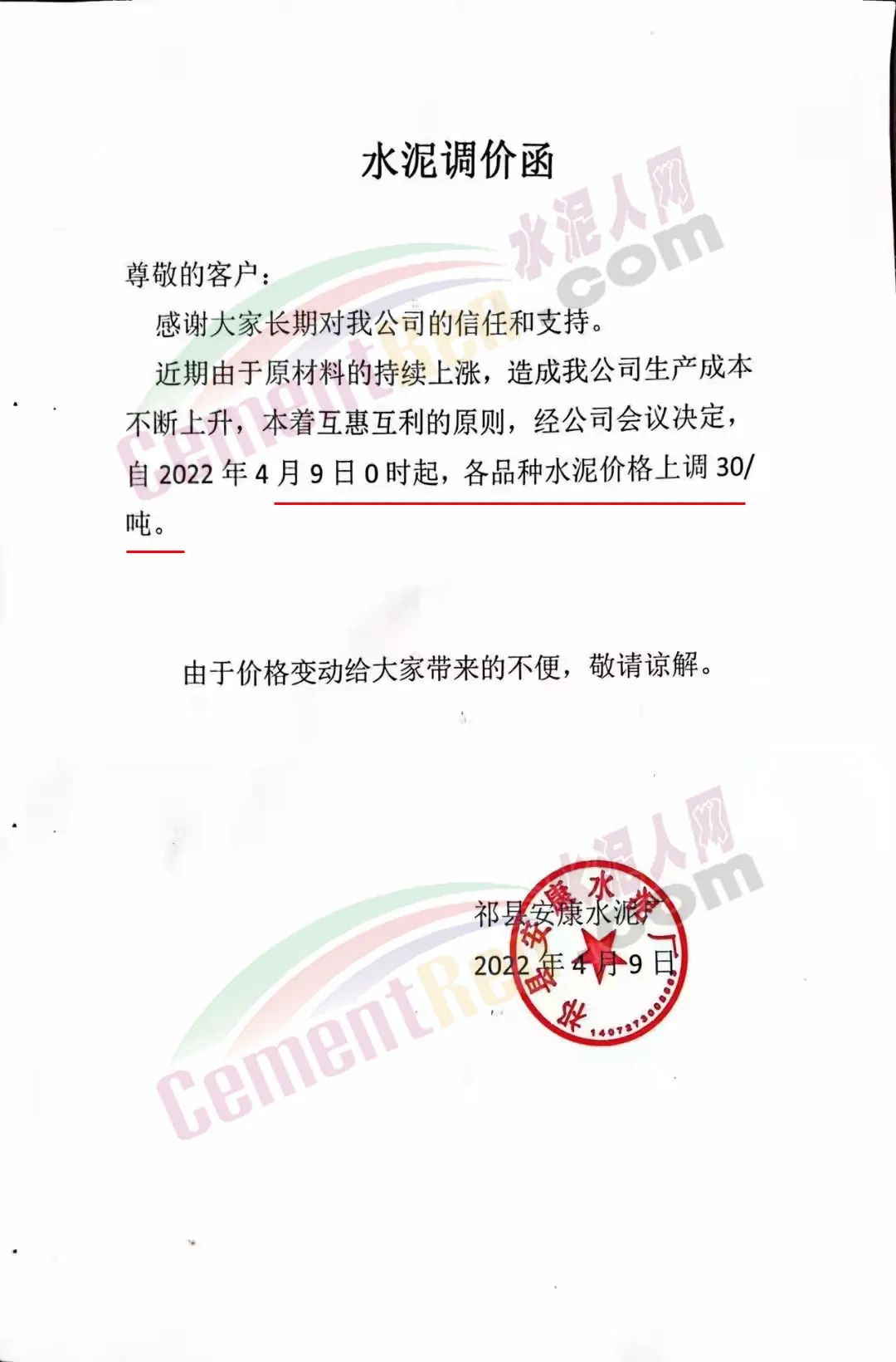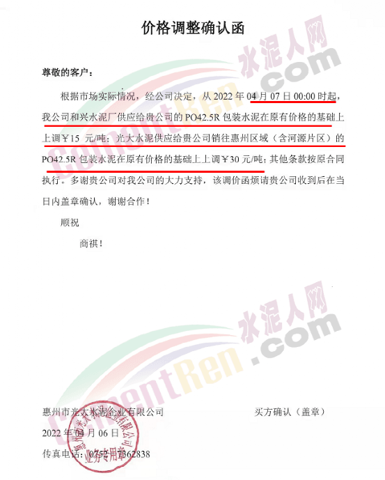 廣東惠州市光大水泥企業(yè)有限公司通知從2022年4月7日0時起,公司和興水泥廠供應給貴公司的P.O42.5R包裝水泥在原有價格的基礎上上調(diào)15元/噸;光大水泥供應給貴公司銷往惠州區(qū)域(含河源片區(qū))的P.O42.5R包裝水泥在原有價格的基礎上上調(diào)30元/噸;其他條款按原合同執(zhí)行。