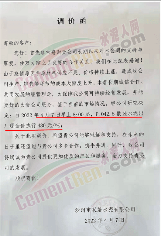 沙河市雙基水泥有限公司通知,由于疫情原因各原材料供應不足、價格持續(xù)上漲,造成公司生產(chǎn)、銷售等環(huán)節(jié)的成本大幅度上升,本著長期誠信合作、共同發(fā)展的經(jīng)營理念,為保障公司可持續(xù)經(jīng)營發(fā)展,并能更好的為貴公司服務,鑒于當前的市場情況,經(jīng)公司研究決定,自2022年4月7日早上8時起,P.O42.5散裝水泥出廠現(xiàn)金價執(zhí)行480元/噸。