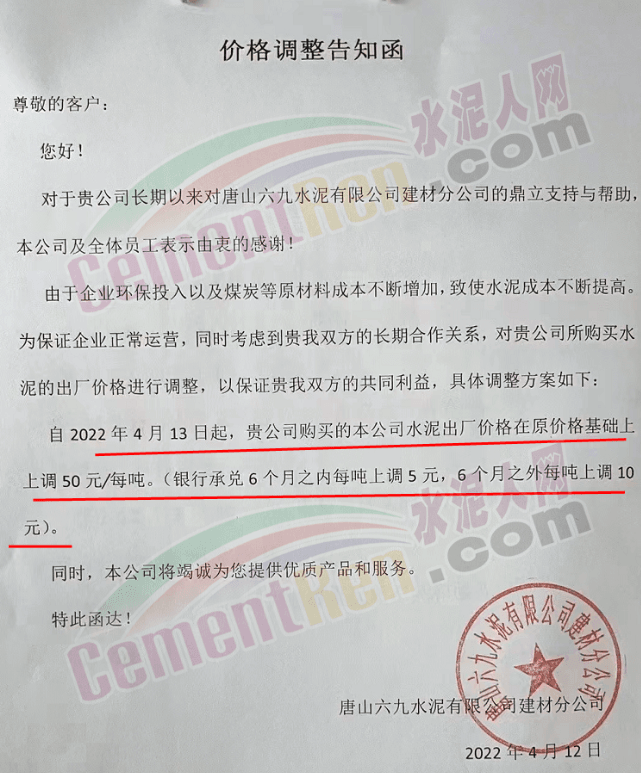 唐山六九水泥有限公司建材分公司通知自4月13日起,上調(diào)水泥價(jià)格50元/噸,銀行承兌6個月之內(nèi)上調(diào)5元/噸,6個月之外上調(diào)10元/噸。