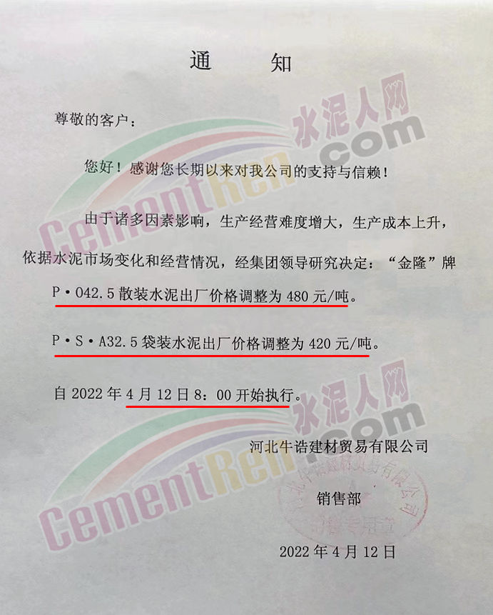 河北牛誥建材貿(mào)易有限公司通知由于諸多因素影響,生產(chǎn)經(jīng)營難度增大 ,生產(chǎn)成本上升,依據(jù)水泥市場變化和經(jīng)營情況,經(jīng)集團(tuán)領(lǐng)導(dǎo)研究決定,自4月12日8時起“金隆”牌P.O42.5散裝水泥出廠價(jià)480元/噸,P.S.A32.5袋裝水泥出廠價(jià)調(diào)整為420元/噸。