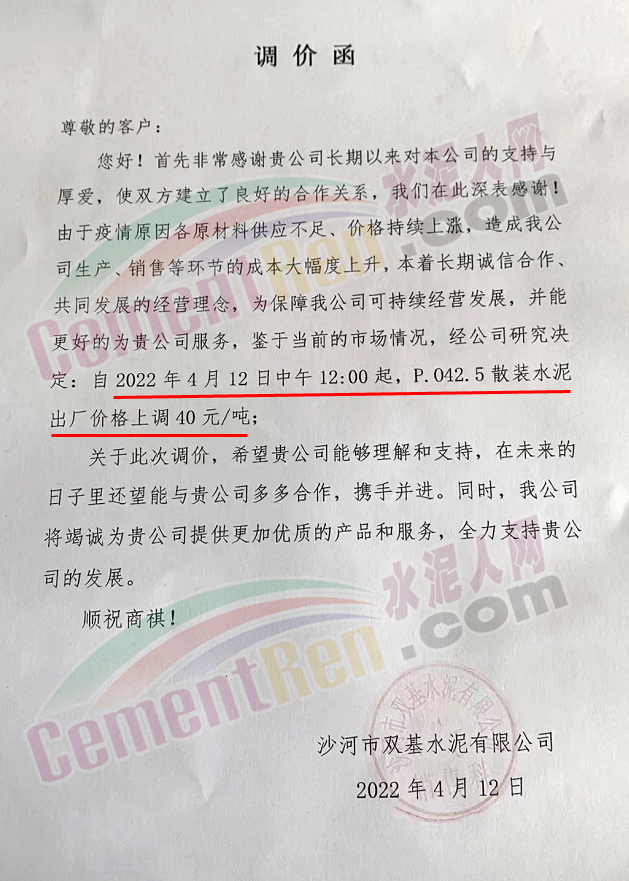 沙河市雙基水泥有限公司通知,由于疫情原因各原材料供應(yīng)不足,價(jià)格持續(xù)上漲,造成公司生產(chǎn),銷售等環(huán)節(jié)的成本大幅度上升,為保障公司可持續(xù)經(jīng)營發(fā)展,鑒于當(dāng)前的市場情況,經(jīng)公司研究決定自4月12日中午12時起,P.O42.5散裝水泥出廠價(jià)格上調(diào)40元/噸。