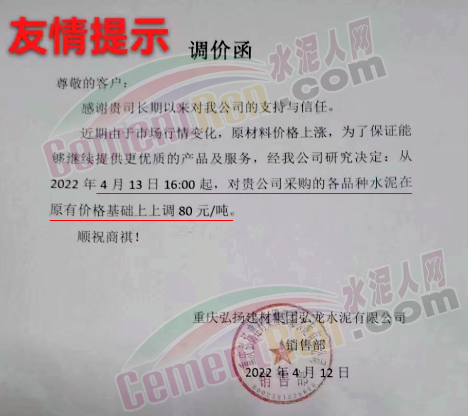 重慶弘揚(yáng)建材集團(tuán)弘龍水泥有限公司通知,由于市場行情變化,原材料價(jià)格上漲,為了保證能夠繼續(xù)提供更優(yōu)質(zhì)的產(chǎn)品及服務(wù),經(jīng)公司研究決定從4月13日16時起,上調(diào)各品種水泥價(jià)格80元/噸。