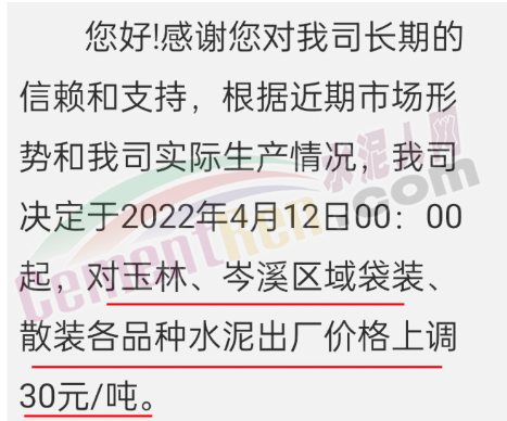 唐山冀東水泥股份有限公司唐山營銷分公司通知自4月12日起,公司銷往唐山及秦皇島地區(qū)地水泥出廠價(jià)在原價(jià)基礎(chǔ)上上調(diào)50元/噸。