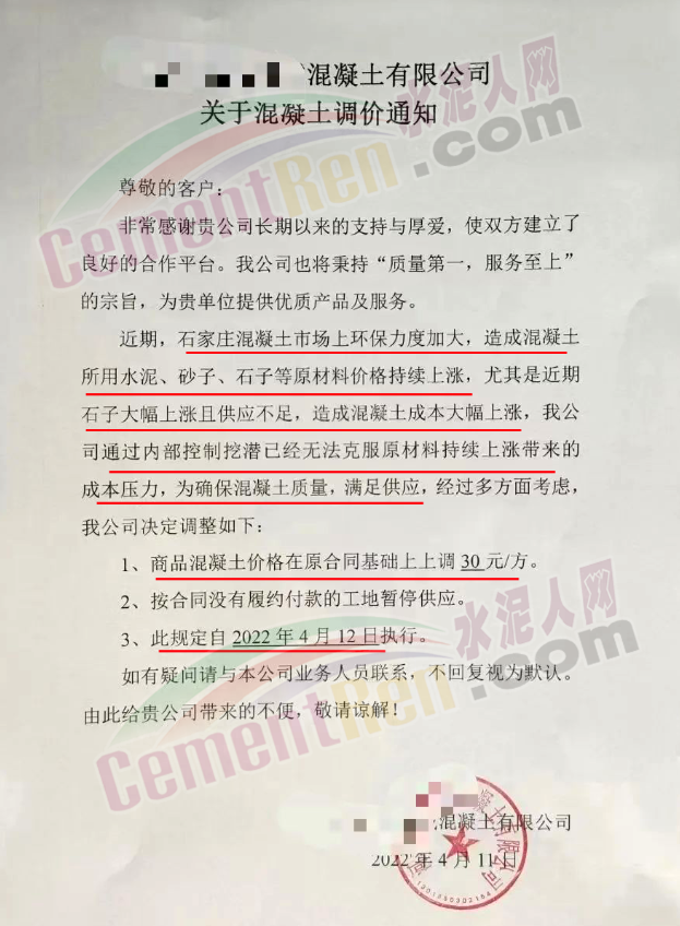 一企業(yè)通知函稱,近期石家莊混凝土市場上因環(huán)保力度加大,造成混凝土所用水泥、砂子、石子等原材料價(jià)格持續(xù)上漲,尤其是近期石子大幅上漲且供不應(yīng)求,造成混凝土成本大幅度上漲,公司無法消化成本急劇上升的壓力,為確?;炷临|(zhì)量,商品混凝土價(jià)格從4月12日8時起在原合同基礎(chǔ)上上調(diào)50元/立方。