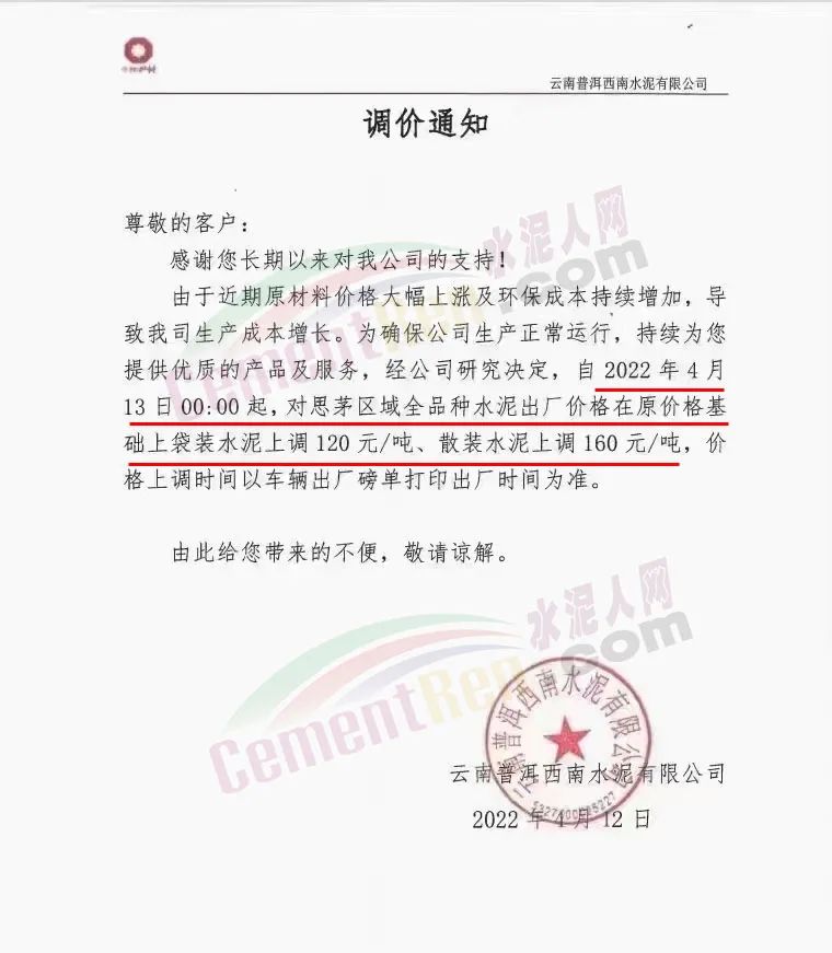 日前,云南普洱西南水泥有限公司調(diào)價通知稱,由于近期原材料價格大幅上漲及環(huán)保成本持續(xù)增加,導(dǎo)致公司生產(chǎn)成本增長。為確保公司生產(chǎn)正常運行,持續(xù)為客戶提供優(yōu)質(zhì)的產(chǎn)品及服務(wù),經(jīng)公司研究決定,自4月13日時起,對思茅區(qū)域全品種水泥袋裝上調(diào)120元/噸,散裝水泥上調(diào)160元/噸,價格上調(diào)時間以車輛出廠磅單打印出廠時間為準(zhǔn)。