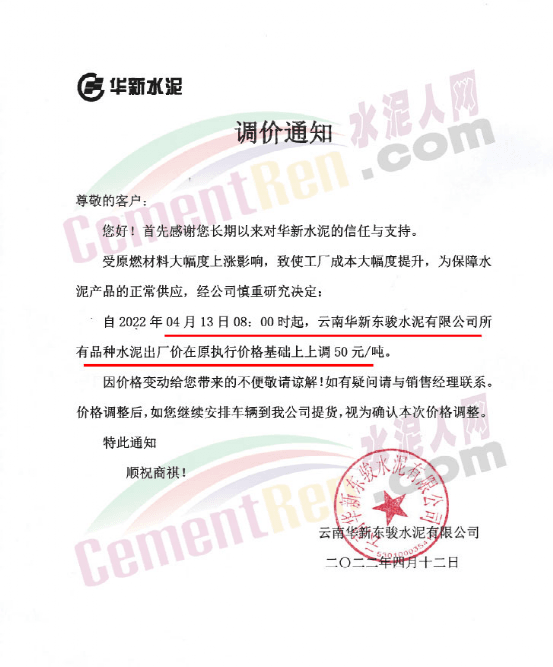 云南華新東駿水泥有限公司通知,受原燃材料大幅度上漲影響,致使工廠成本大幅度提升。為保證水泥產(chǎn)品正常供應(yīng),經(jīng)公司慎重研究決定,自4月13日8時起所有品種水泥出廠價上調(diào)50元/噸。