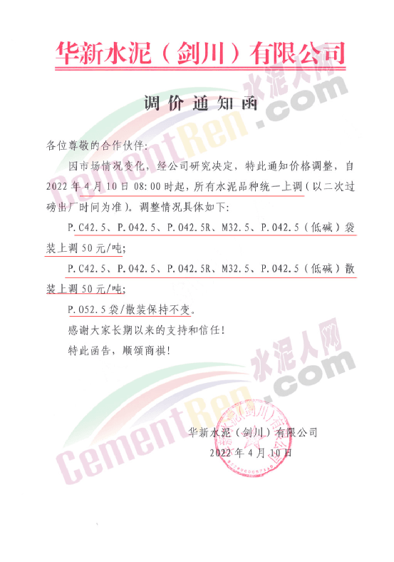 華新水泥(劍川)有限公司通知因市場情況變化,經(jīng)公司研究決定自4月10日8時起,32.5級和42.5級所有品種水泥上調(diào)50元/噸。