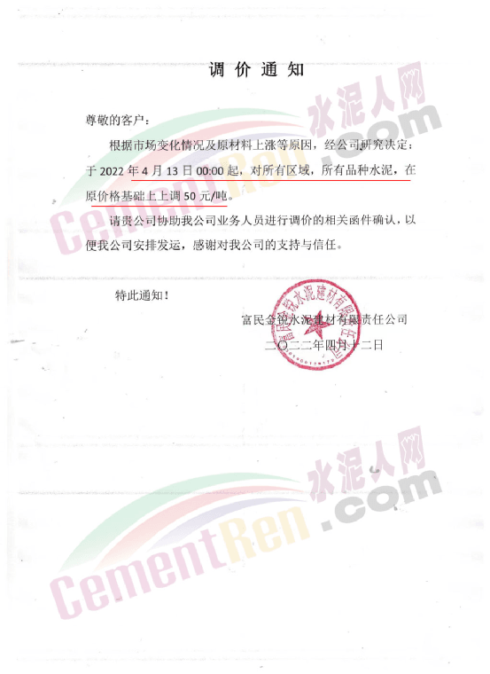 富民金銳水泥建材有限責(zé)任公司通知,自4月13日0時起,對所有區(qū)域,所有品牌水泥價格上調(diào)50元/噸。