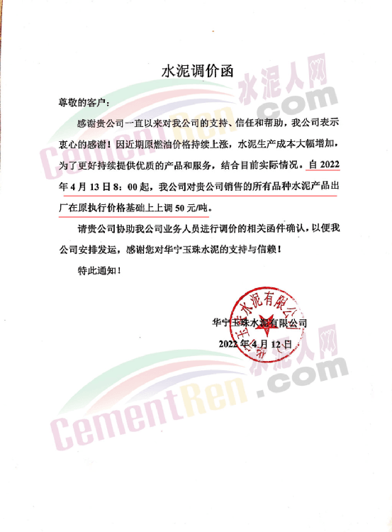 華寧玉珠水泥有限公司通知,自4月13日8時起,所有品種水泥出廠價上調(diào)50元/噸。