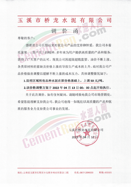云南中瑞(集團)建材有限公司通知,4月13日0時起,昆明、安寧片區(qū)所有規(guī)格水泥出廠價上調(diào)50元/噸。