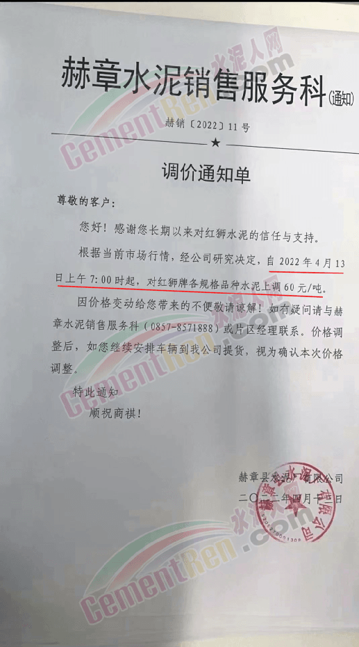 同期,位于貴州區(qū)域赫章水泥廠通知根據(jù)當(dāng)前市場行情經(jīng)公司研究決定,自4月13日上午7時起,對紅獅牌各規(guī)格品種水泥上調(diào)60元/噸,上調(diào)后P.O42.5水泥出廠報價400元/噸。