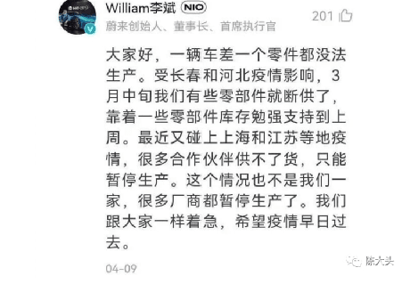 4月9日,蔚來汽車公開表示,蔚來位于吉林,上海,江蘇等地的供應鏈伙伴已經陸續(xù)停產,零部件無法到位,導致整車停止生產!