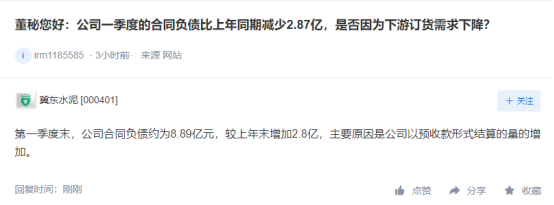 冀東水泥回復(fù):第一季度末,公司合同負(fù)債約為8.89億元,較上年末增加2.8億,主要原因是公司以預(yù)收款形式結(jié)算的量的增加。