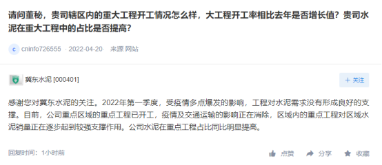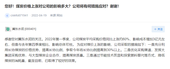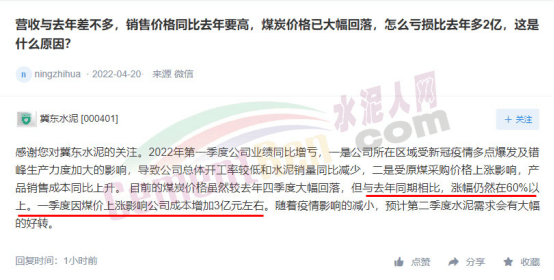 冀東水泥回復(fù):2022年第一季度公司業(yè)績同比增虧,一是公司所在區(qū)域受新冠疫情多點(diǎn)爆發(fā)及錯(cuò)峰生產(chǎn)力度加大的影響,導(dǎo)致公司總體開工率較低和水泥銷量同比減少;二是受原煤采購價(jià)格上漲影響,產(chǎn)品銷售成本同比上升。