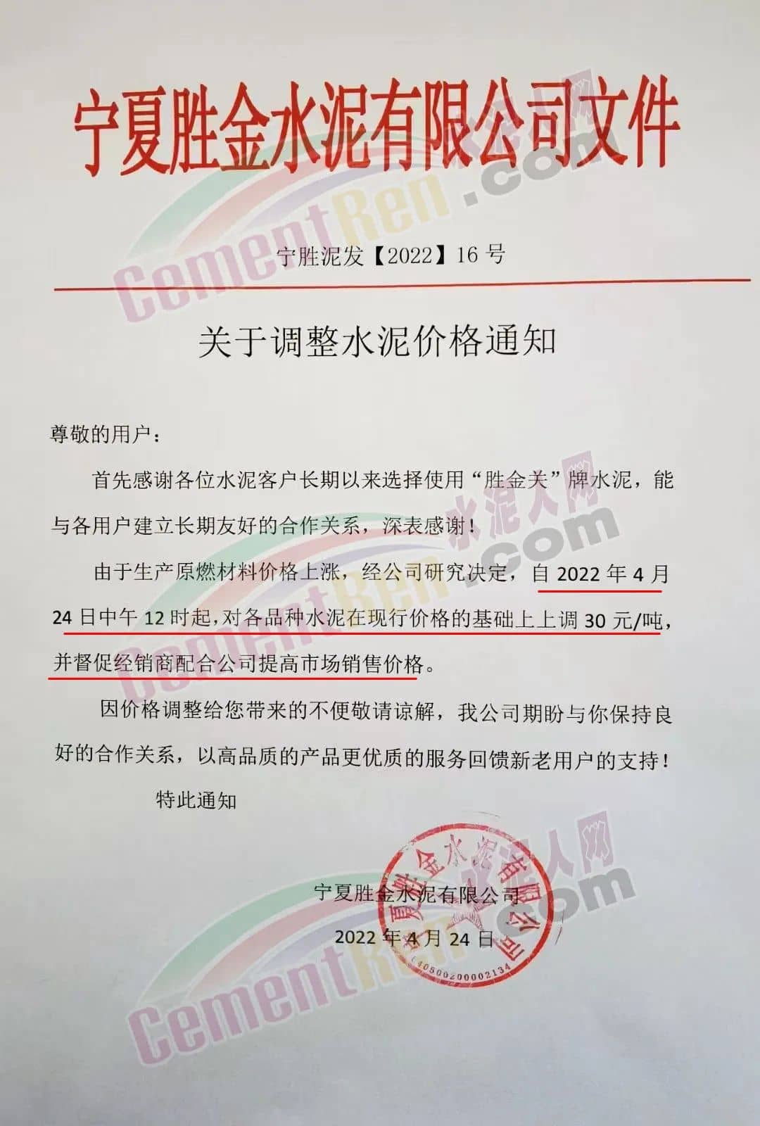 盡管絕大多數(shù)區(qū)域水泥市場(chǎng)行情低迷,但是,為了緩解成本上漲壓力,多區(qū)域主要品牌企業(yè)仍持續(xù)推漲水泥價(jià)格。日前寧夏回族自治區(qū)賽馬水泥、瀛海天祥、天元建材等多家品牌企業(yè)通知上調(diào)水泥價(jià)格20-30元/噸。寧夏勝金水泥有限公司通知,由于生產(chǎn)原燃材料價(jià)格上漲,自4月24日中午12時(shí)起對(duì)各品種水泥在現(xiàn)行價(jià)格基礎(chǔ)上上調(diào)30元/噸,并督促經(jīng)銷(xiāo)商配合公司提高市場(chǎng)銷(xiāo)售價(jià)格。
