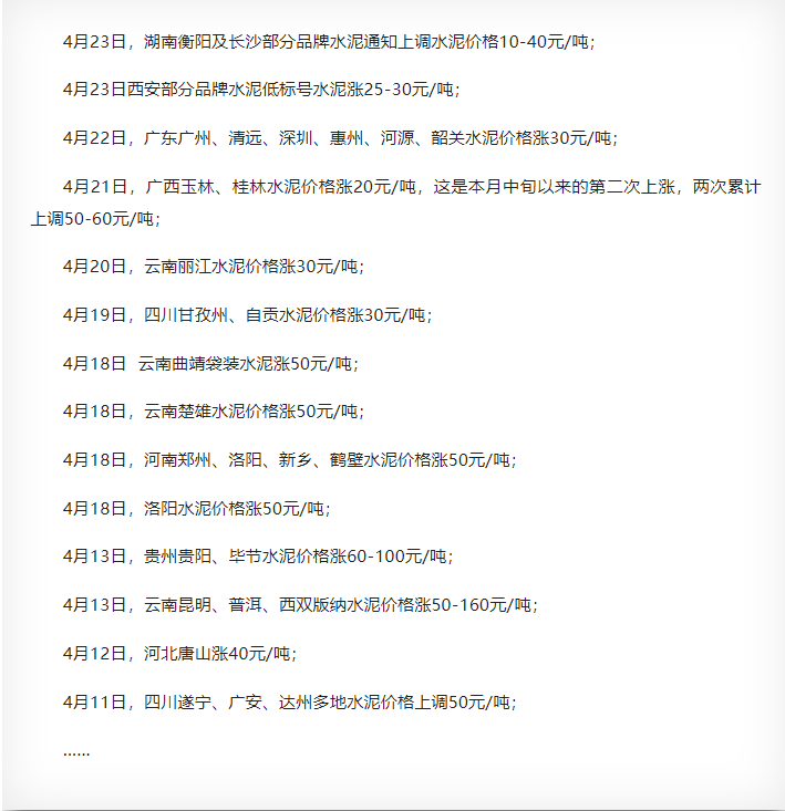 混凝土方面,跟隨水泥漲價(jià)同步推漲。4月21日,云南普洱混凝土價(jià)格漲10元/方;4月19日,云南麗江混凝土價(jià)格漲20元/方;4月18日,廣東云浮混凝土價(jià)格漲20元/方;4月12日,石家莊混凝土價(jià)格漲30元/方……