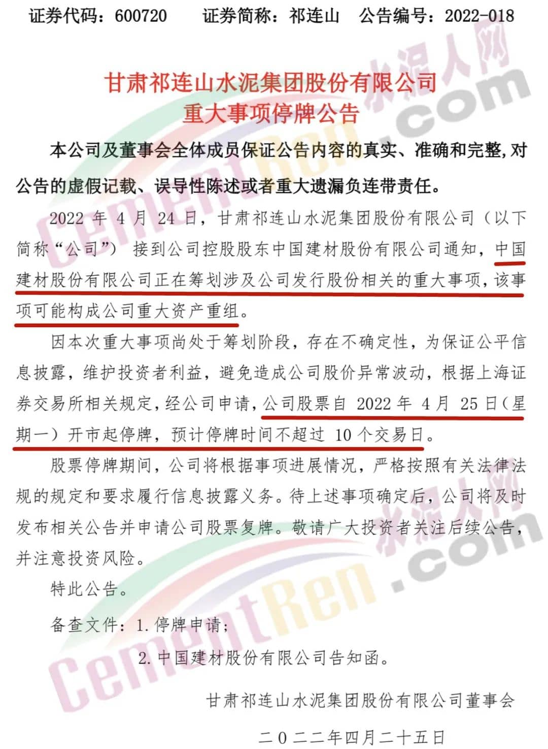 4月25日,甘肅祁連山水泥集團(tuán)股份有限公司發(fā)布公告稱,中國(guó)建材股份有限公司正在籌劃涉及祁連山水泥發(fā)行股份相關(guān)的重大事項(xiàng),該事項(xiàng)可能構(gòu)成公司重大資產(chǎn)重組。祁連山水泥股票自2022年4月25日開市起停牌,預(yù)計(jì)停牌時(shí)間不超過(guò)10個(gè)交易日。