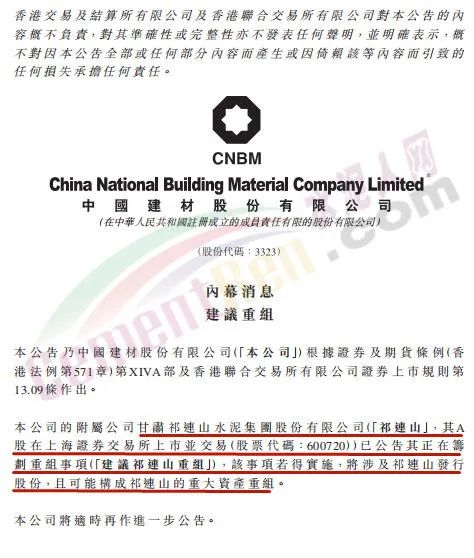 同日,中國(guó)建材也發(fā)布公告,公司附屬公司甘肅祁連山水泥集團(tuán)股份有限公司已公告其正在籌劃重組事項(xiàng),該事項(xiàng)若得實(shí)施,將涉及祁連山發(fā)行股份,且可能構(gòu)成祁連山的重大資產(chǎn)重組。