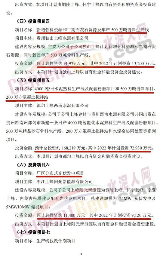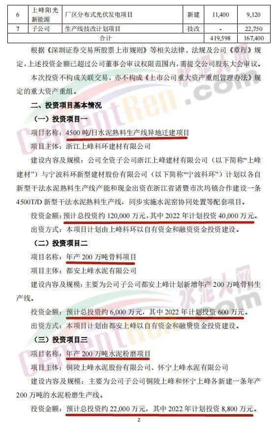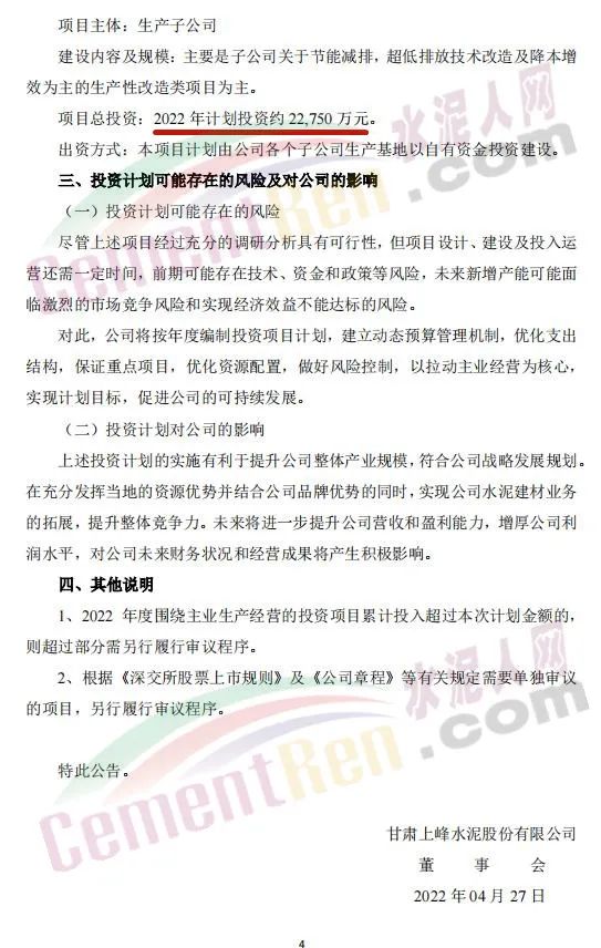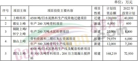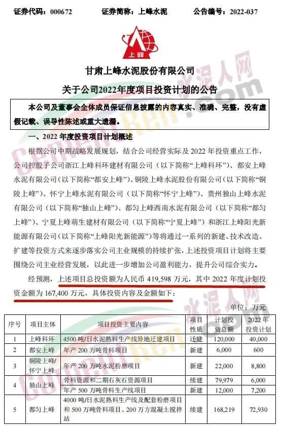 4月27日,甘肅上峰水泥股份有限公司發(fā)布《關(guān)于公司2022年度項(xiàng)目投資計(jì)劃的公告》稱,2022年,其控股子公司浙江上峰科環(huán)建材有限公司、都安上峰水泥有限公司、銅陵上峰水泥股份有限公司、懷寧上峰水泥有限公司、貴州獨(dú)山上峰水泥有限公司、都勻上峰西南水泥有限公司、寧夏上峰萌生建材有限公司和浙江上峰陽光新能源有限公司等將通過一系列的新建、技術(shù)改造、擴(kuò)建等投資方式來逐步落實(shí)公司主業(yè)規(guī)模的持續(xù)擴(kuò)張。